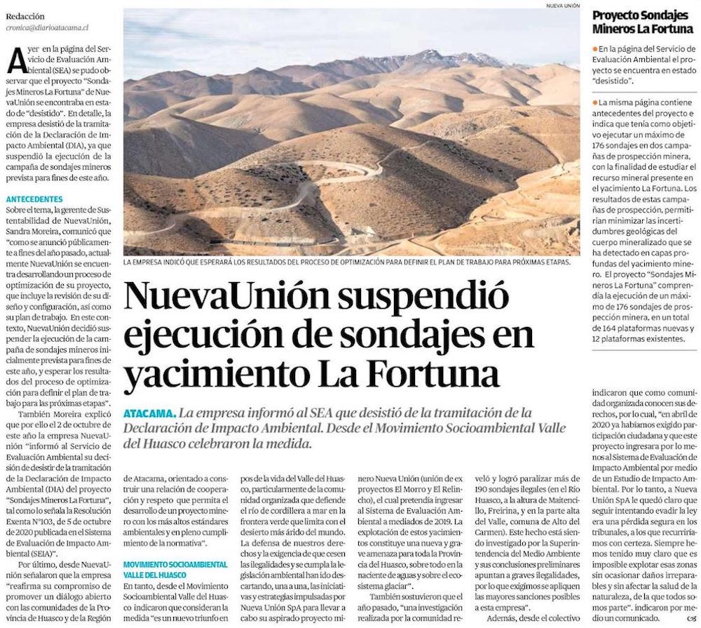 Valle del Huasco: SEA de Atacama dio por desistido proyecto de sondaje de minera Nueva Unión SpA - (elciudadano)