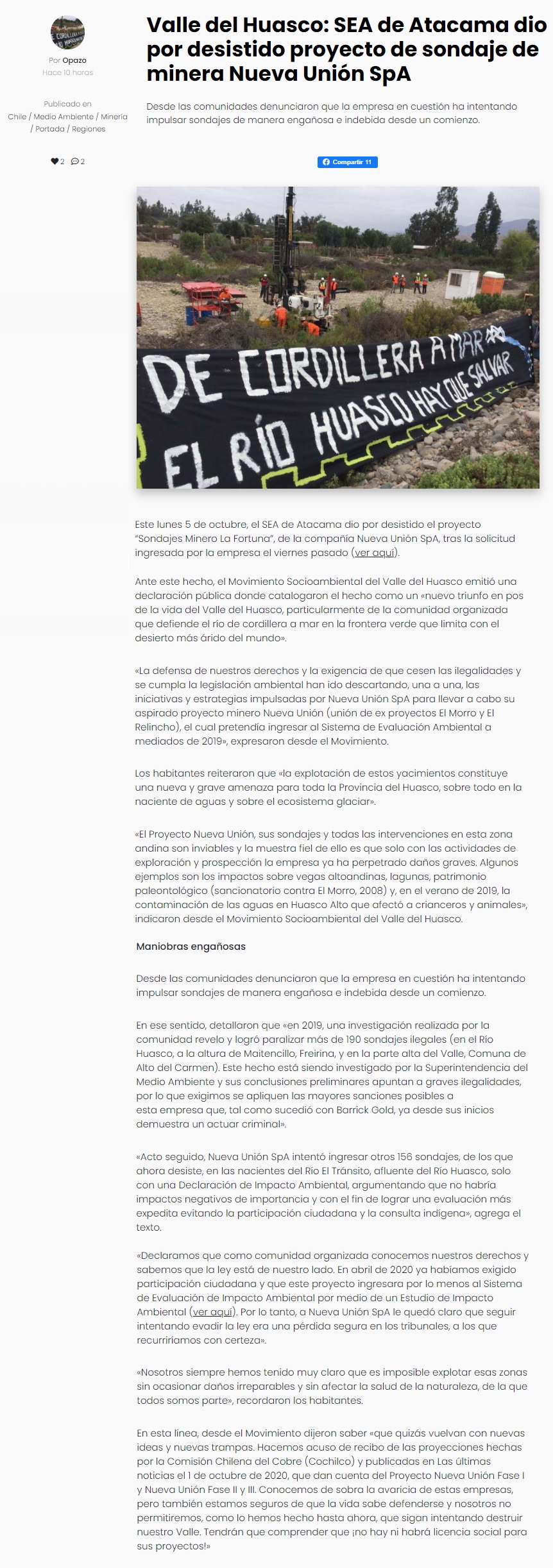 NuevaUnión suspendió ejecución de sondajes en yacimiento La Fortuna - (El Diario de Atacama)