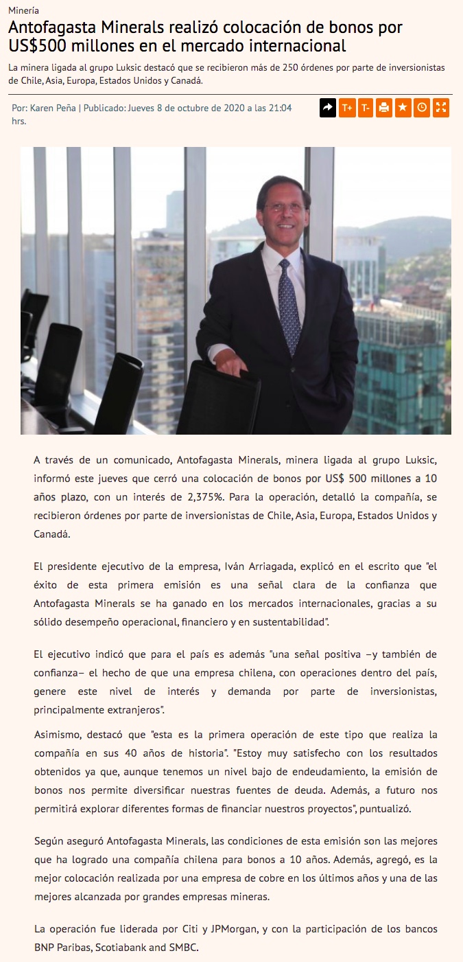 Antofagasta Minerals realiza colocación de bonos por US$500 millones en el mercado internacional - (Pulso Online)