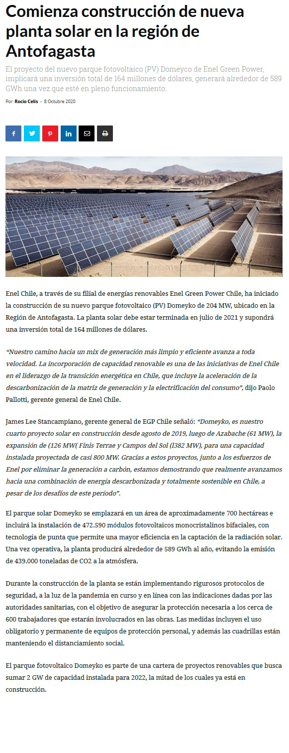 Enel comenzó obras por US$164 millones de la Planta Solar Domeyko de Antofagasta - (El Mercurio de Antofagasta)