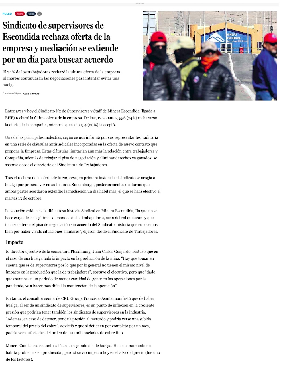 Sindicato de supervisores de mina Escondida rechaza última oferta de la empresa e iniciarán huelga - (emol)