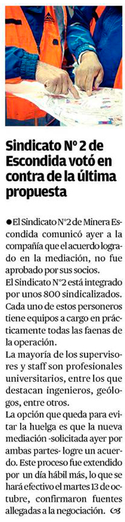 Supervisores de Escondida rechazan oferta - (El Mercurio de Santiago)