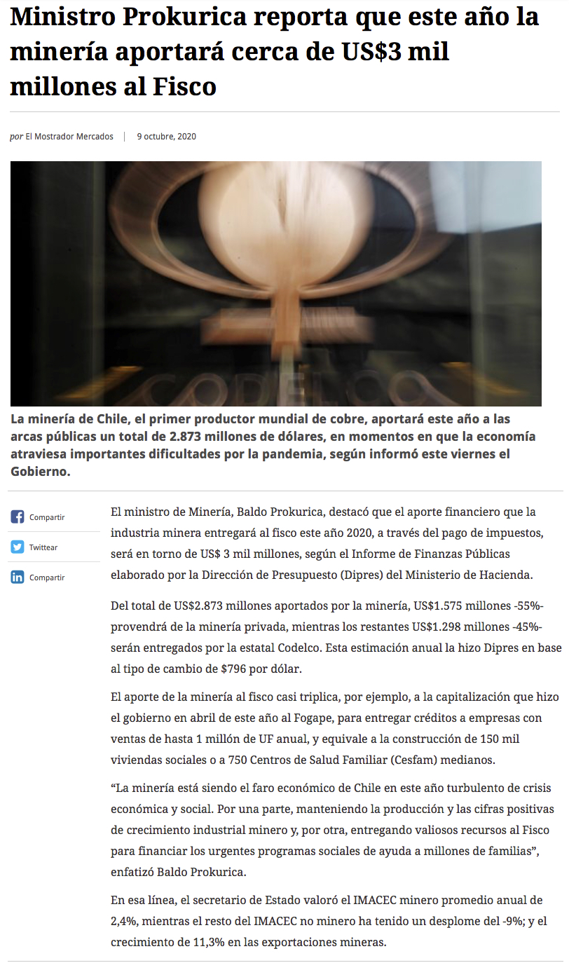 Gobierno resalta aporte de casi US$3 mil mills. del sector minero al fisco - (El Mercurio de Santiago)