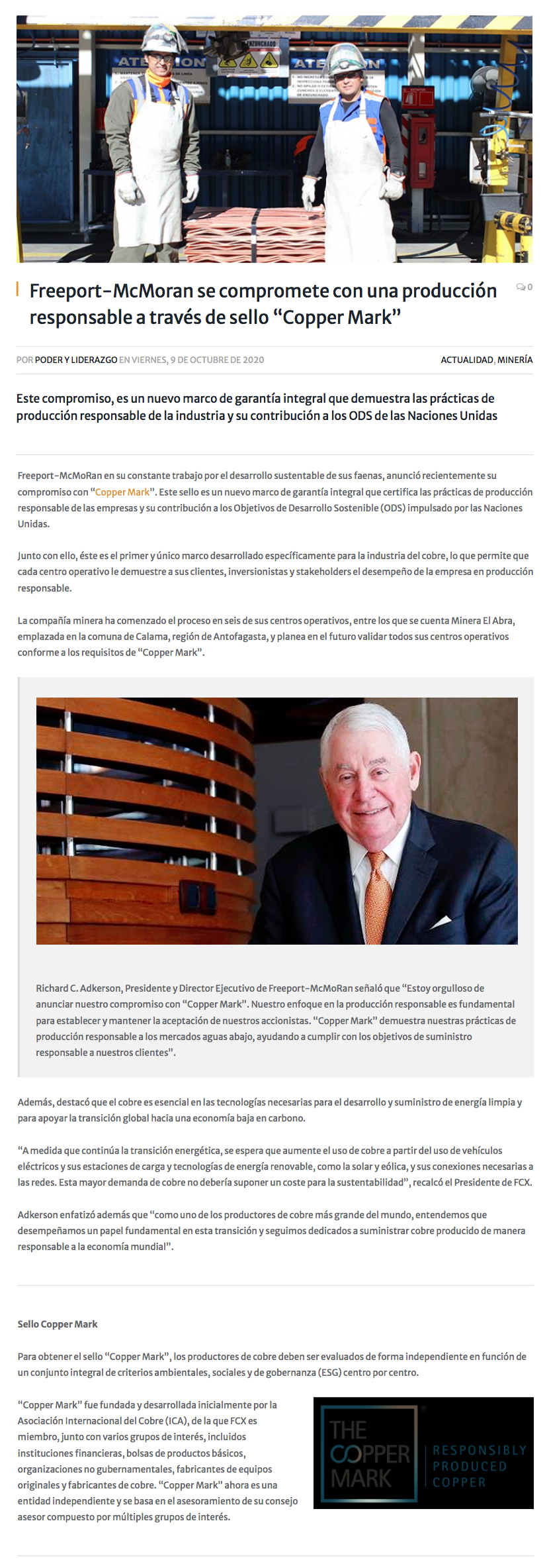El Abra se compromete con "Copper Mark" y la producción responsable - (El Mercurio de Calama)