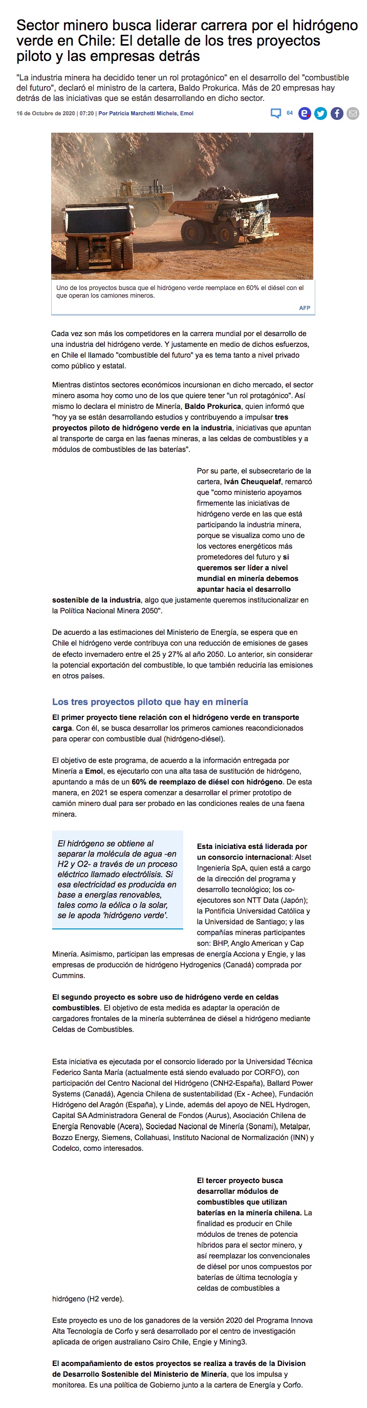Gobierno destaca desarrollo de 3 proyectos piloto de hidrógeno verde en la minería - (biobiochile online)