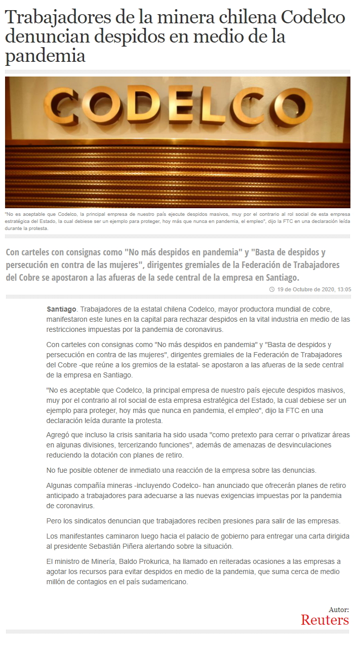 Federación de Trabajadores del Cobre denuncia despidos durante pandemia en Codelco - (emol)