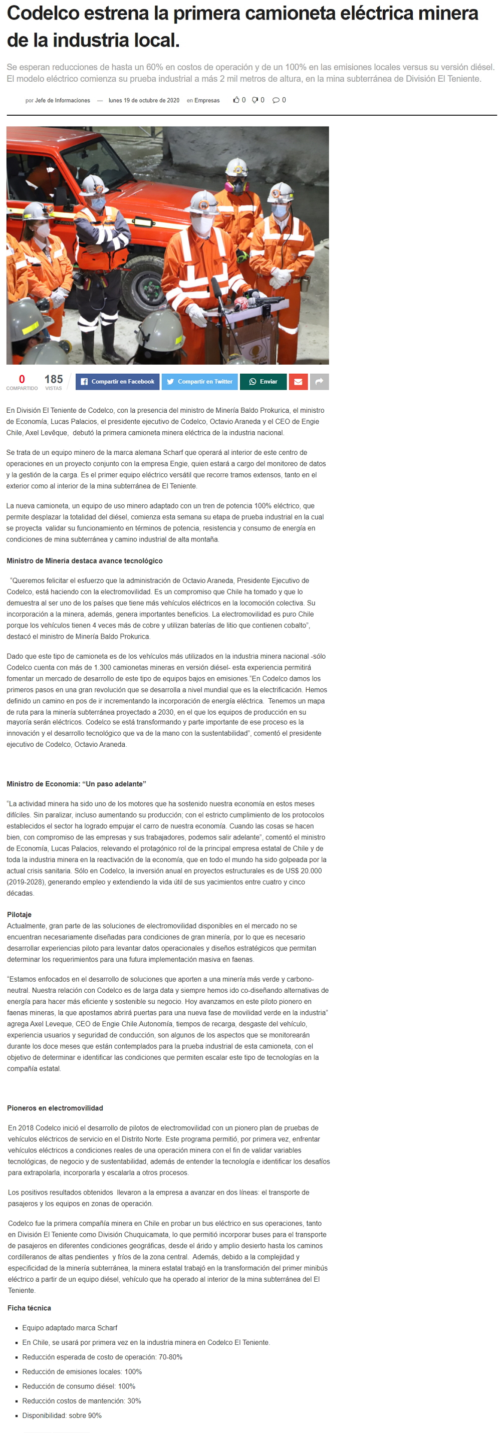 Rescatista de los 33 mineros manejará primera camioneta eléctrica en una mina - (Las Últimas Noticias)