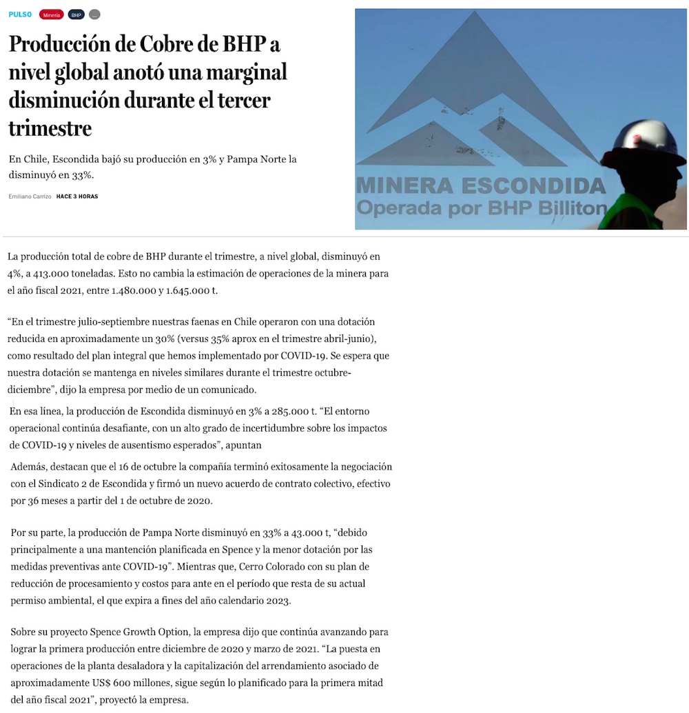 Producción de Cobre de BHP a nivel global anotó disminución en 3T - (Pulso)