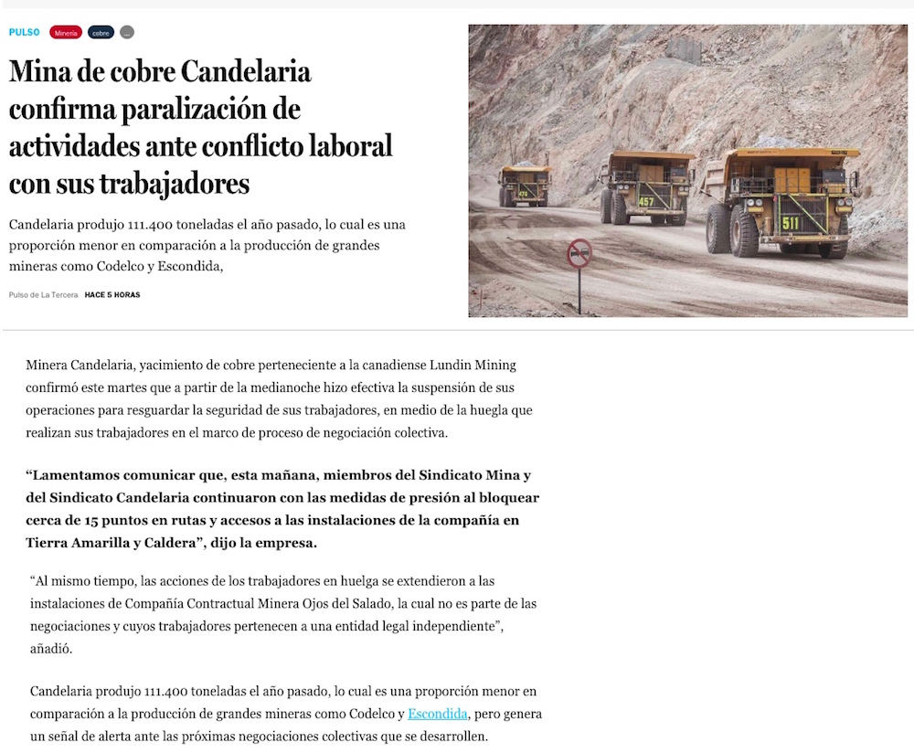 Mina Candelaria suspende operaciones por huelga y el Gobierno pide un “esfuerzo especial” - (El Mostrador)
