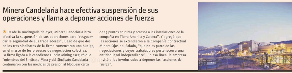 Mina Candelaria suspende operaciones por huelga y el Gobierno pide un “esfuerzo especial” - (El Mostrador)