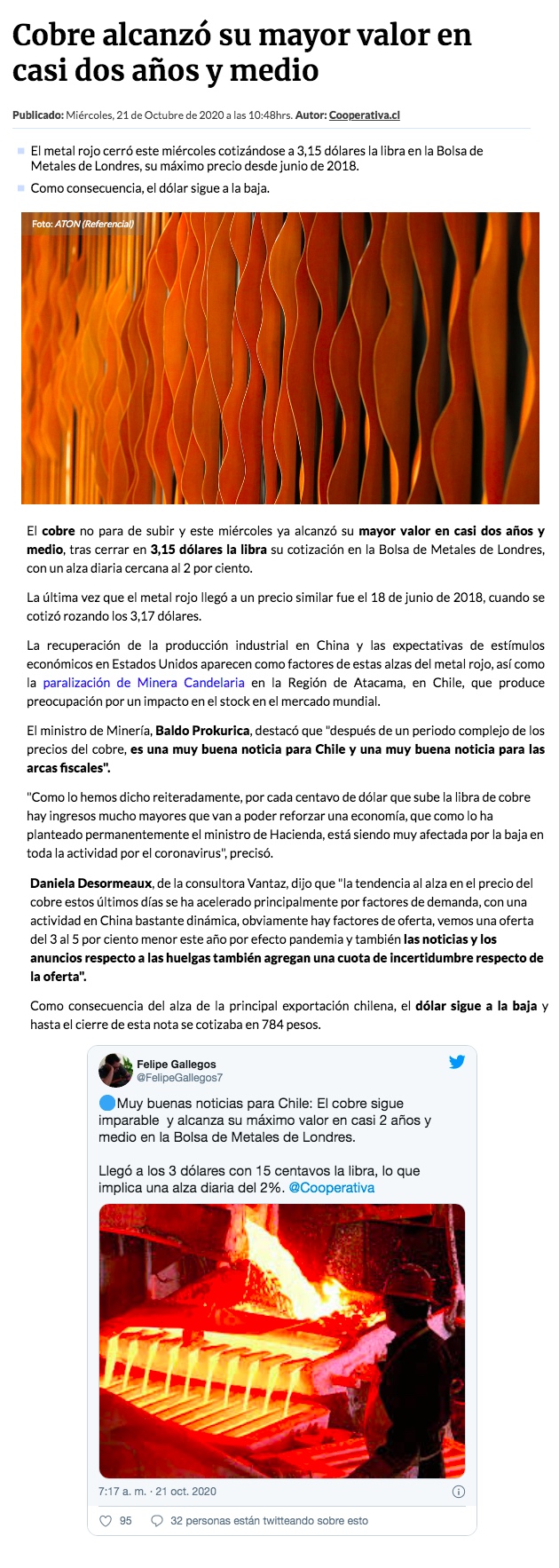 Cotización del cobre mantiene su ritmo y logra el mayor precio en 27 meses - (El Mercurio de Santiago)