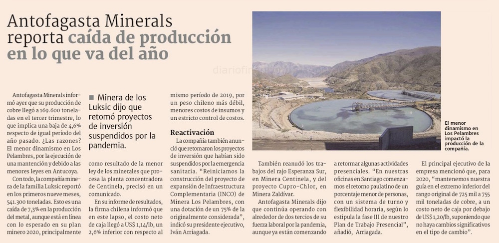 Minera de los Luksic reporta caída de producción en tercer trimestre y retoma proyectos de inversión suspendidos por pandemia - (DF Online)