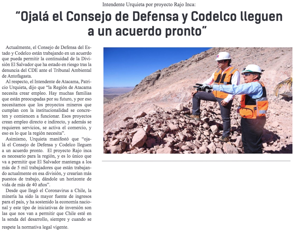 Intendente de Atacama por proyecto Rajo Inca: “Ojalá el Consejo de Defensa y Codelco lleguen a un acuerdo pronto” - (elquehaydecierto)