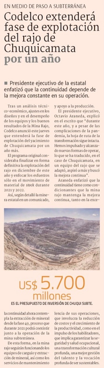 Codelco anuncia extensión en explotación del rajo de Chuqui - (El Mercurio de Santiago)