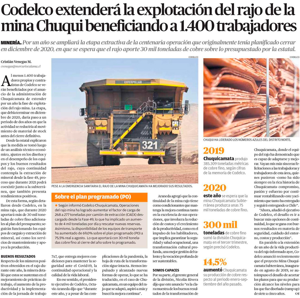 Codelco anuncia extensión en explotación del rajo de Chuqui - (El Mercurio de Santiago)