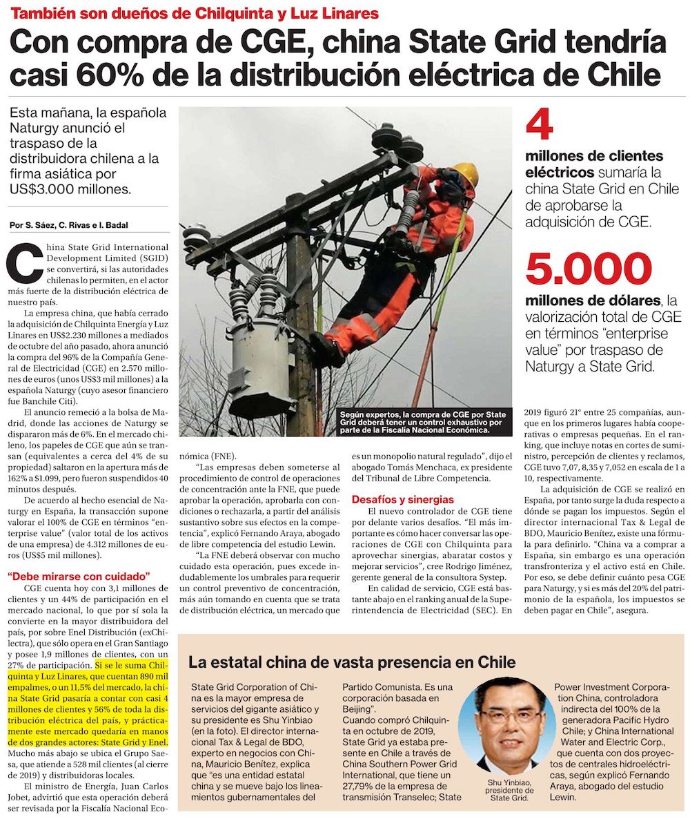 Estatal china adquiere CGE y concentrará el 57% de los clientes de la distribución eléctrica - (El Mercurio de Santiago)