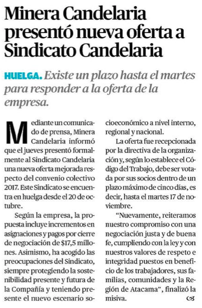 Minera Candelaria eleva apuesta y presenta nueva oferta a sindicato de trabajadores - (DF Online)