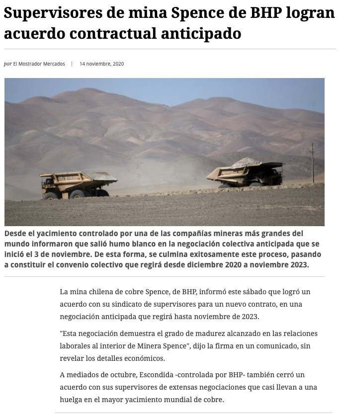 Supervisores de mina Spence de BHP logran acuerdo anticipado - (El Mercurio de Antofagasta)