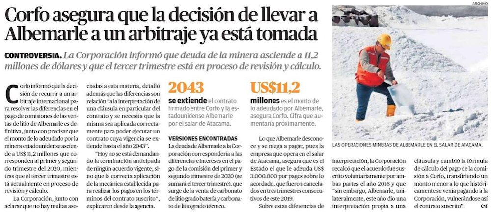 Chile promete iniciar arbitraje contra la productora de litio Albemarle por regalías - (americaeconomia online)