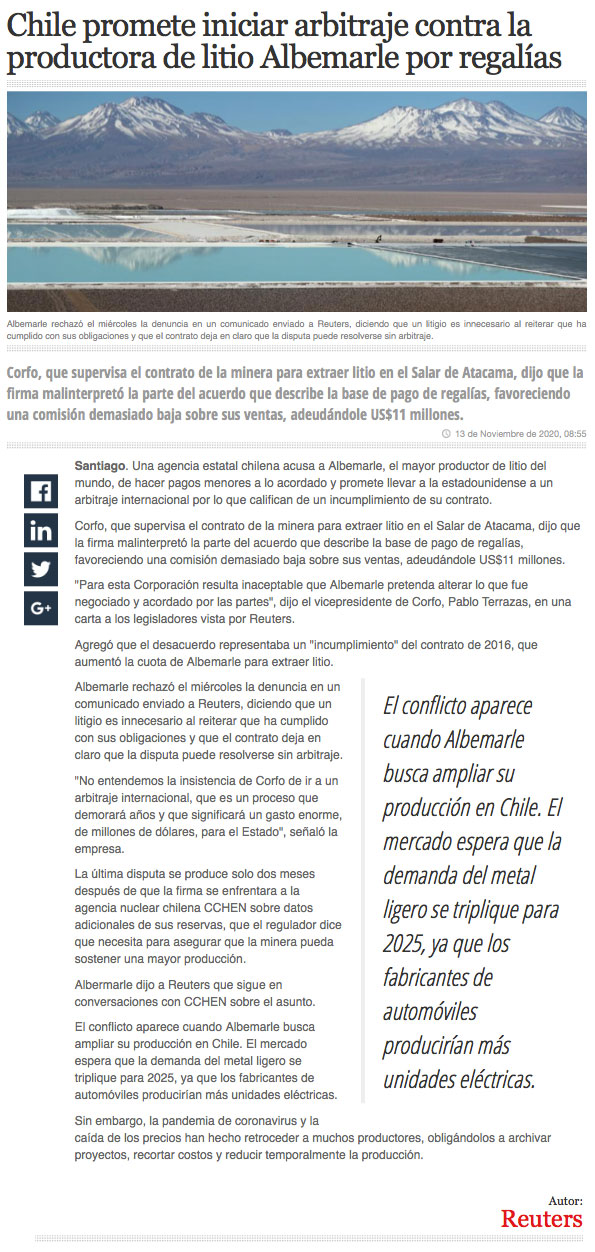 Corfo asegura que la decisión de llevar a Albemarle a un arbitraje ya está tomada - (El Mercurio de Calama)