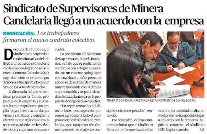 Candelaria logra acuerdo con dos de sus sindicatos - (El Mercurio de Santiago)