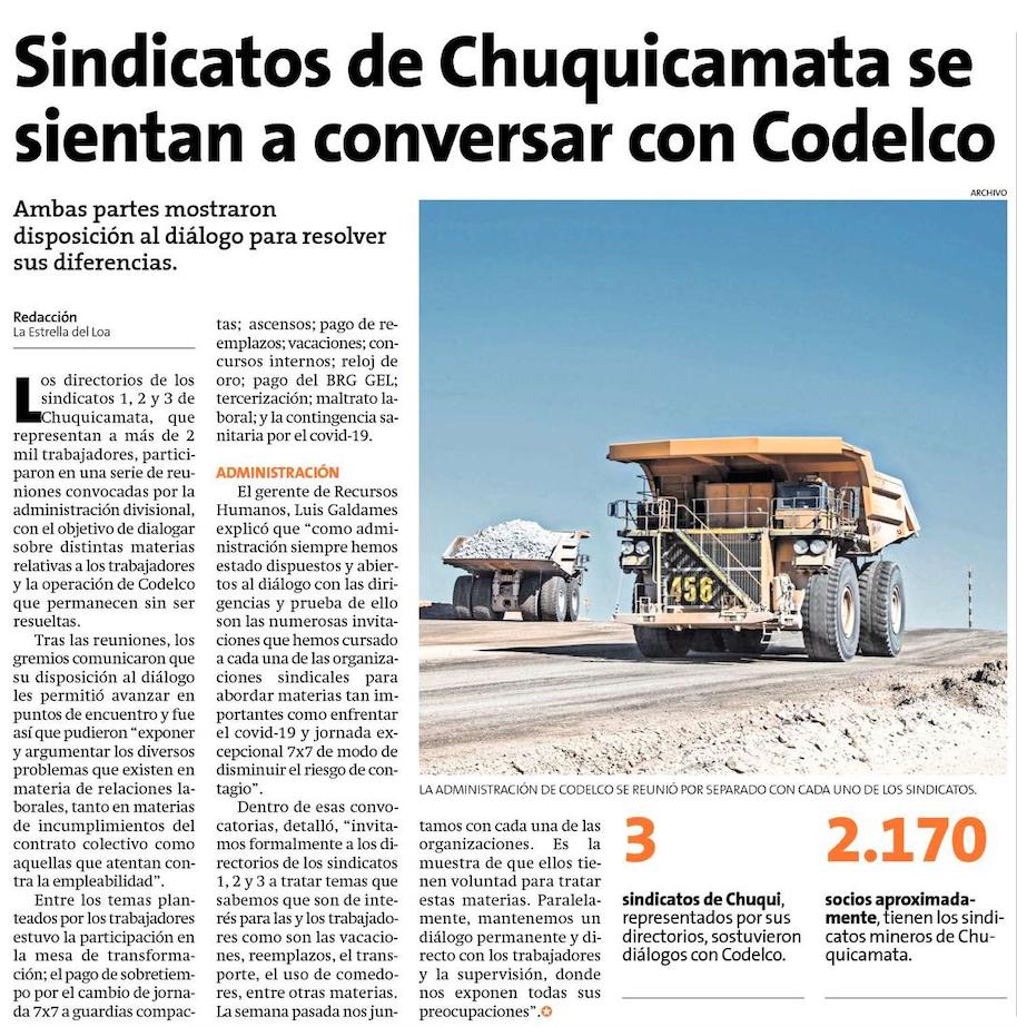 Sindicatos de Chuqui se sientan a la mesa con Codelco para resolver sus diferencias - (El Mercurio de Calama)