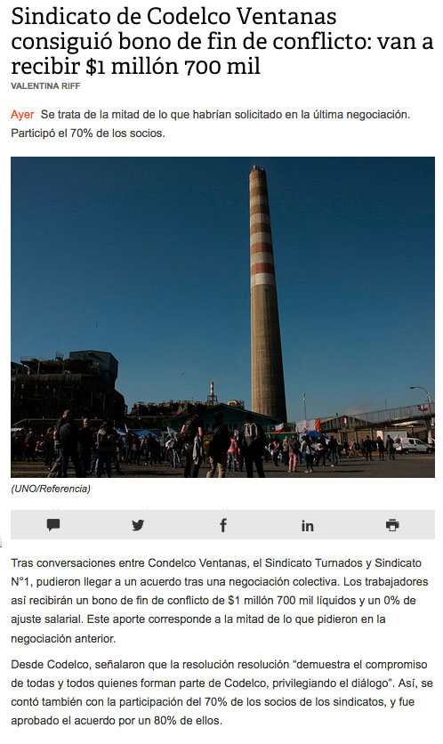 Codelco Ventanas cerró con anticipo negociación con sindicatos: bono de $1,7 millones y reajuste 0% - (biobiochile online)