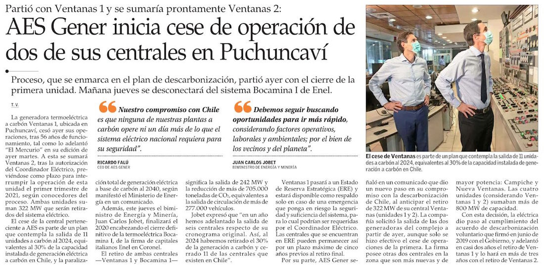 Cierre de Ventanas 1 y 2 reducirá emisión de CO2 en 2 millones de T. - (El Mercurio de Valparaíso)