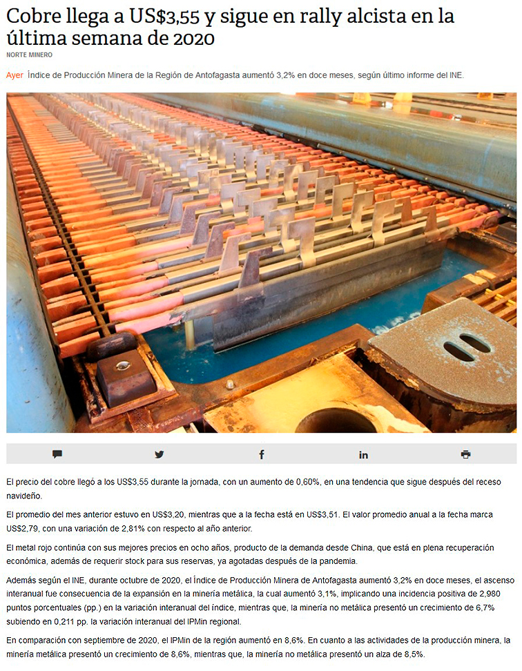 Cobre cerraría 2020 con el tercer mayor crecimiento anual de la última década - (El Mercurio de Santiago)