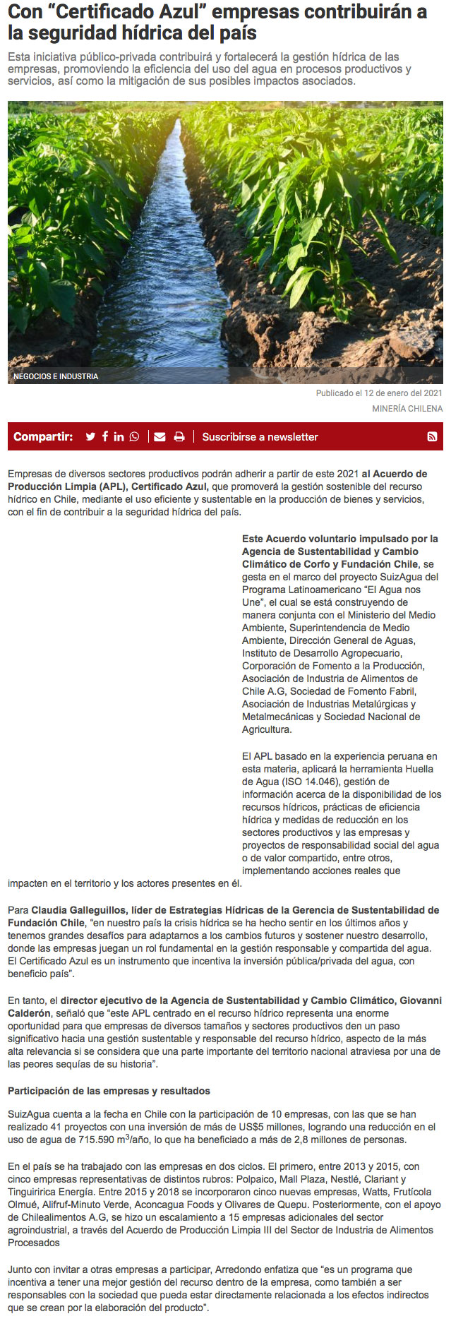Con “Certificado Azul” empresas contribuirán a la seguridad hídrica del país - (El Longino de Iquique)