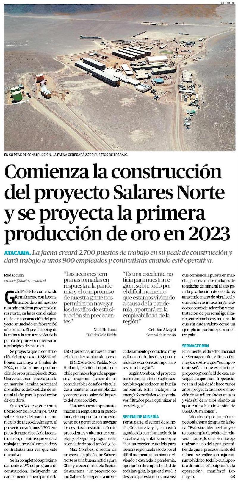 Gold Fields inicia obras de proyecto de oro por US$ 860 millones en Región de Atacama - (El Mercurio de Santiago)