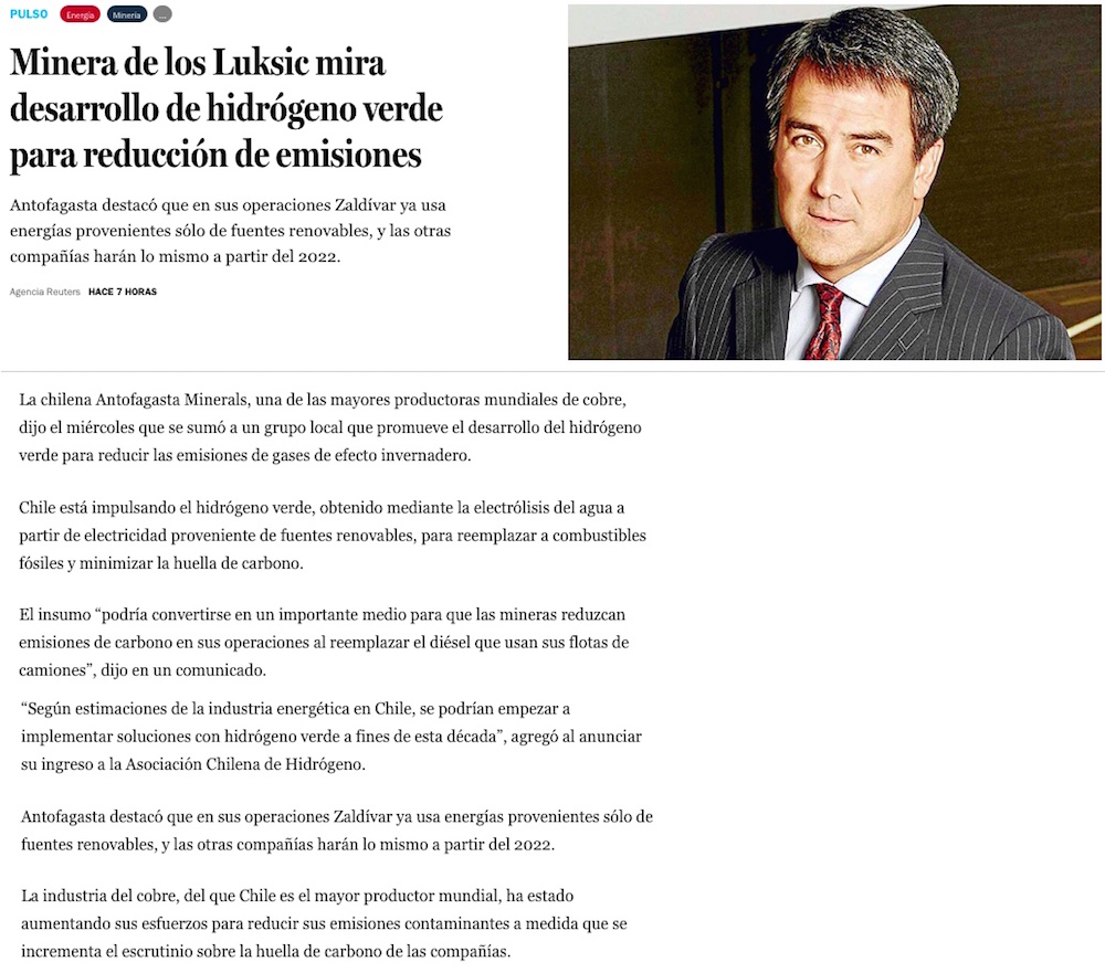 Minera del grupo Luksic se convierte en la primera del país en ingresar a la Asociación Chilena de Hidrógeno - (DF Online)
