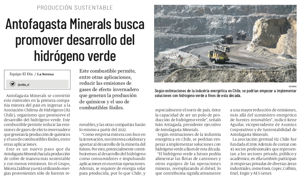 AMSA es la primera minera en ingresar a la Asociación Chilena de Hidrógeno - (El Mercurio de Calama)