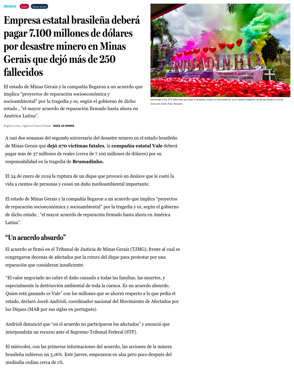 Brasil: siderúrgica Vale pagará acuerdo compensatorio de casi US$ 7.000 millones por desastre de Brumadinho - (americaeconomia online)
