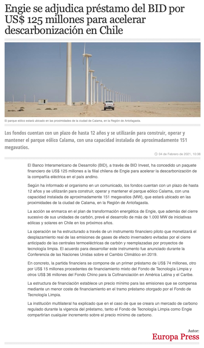 Engie recibe US$125 millones para construir el parque eólico Calama - (El Mercurio de Calama)