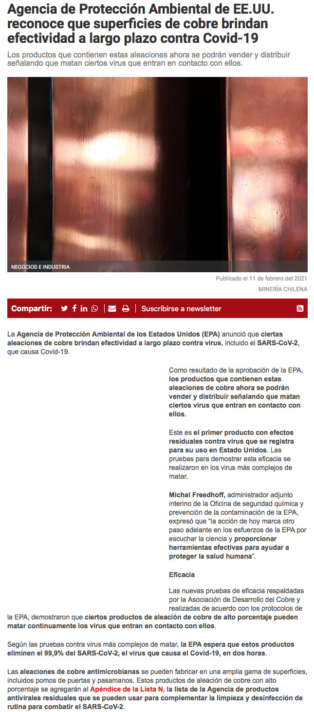 Agencia para la Protección Ambiental de EEUU reconoce a las aleaciones de cobre como superficies que permiten combatir el coronavirus - (DF Online)