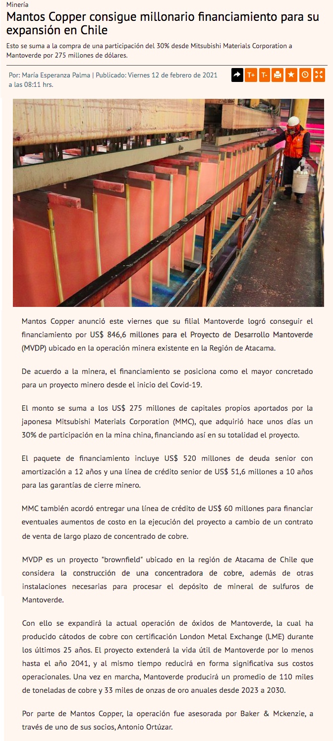 Mantos Copper cierra financiamiento para expansión de Mantoverde - (El Mercurio de Santiago)
