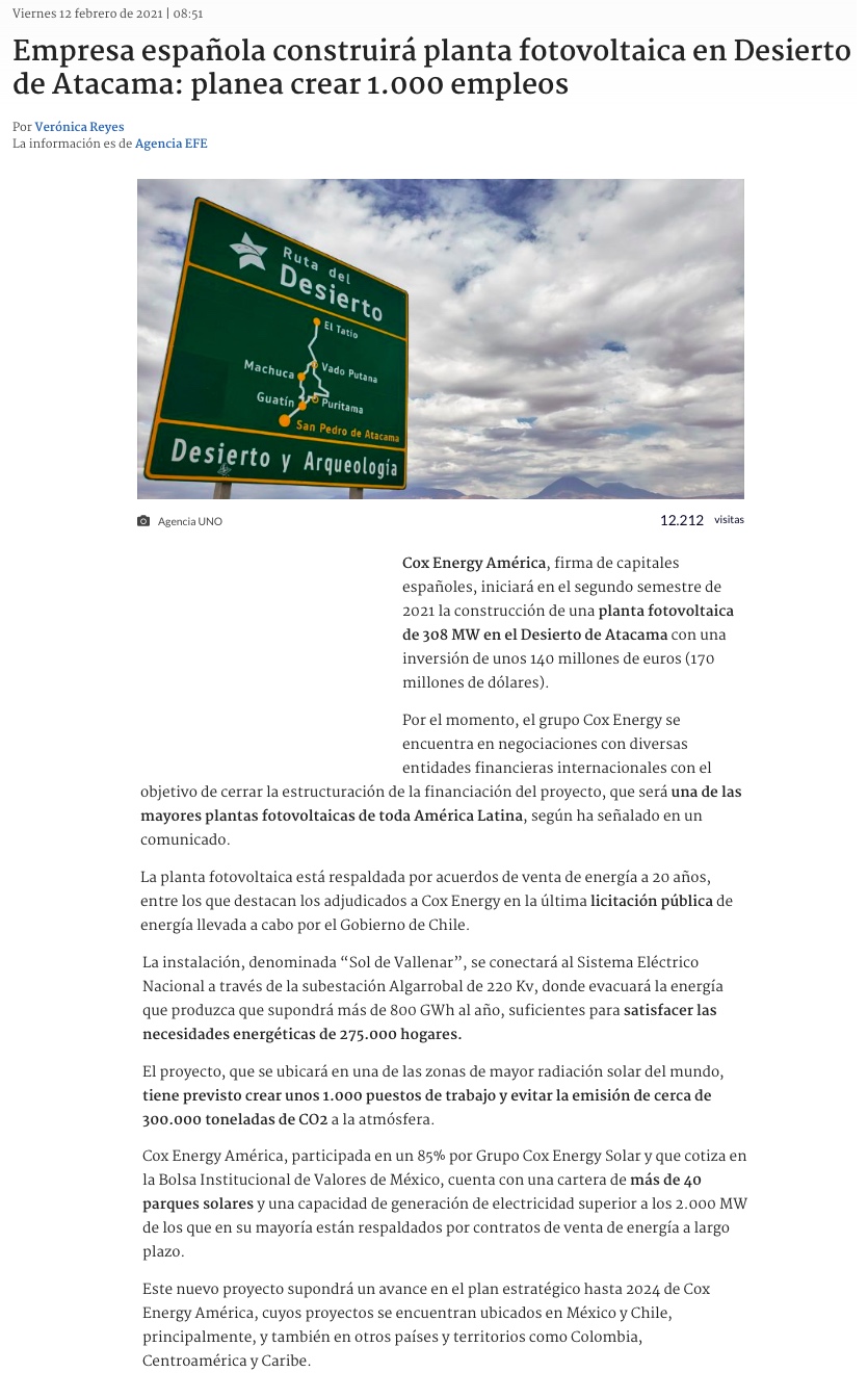 Cox Energy América levantará una planta fotovoltaica en el Desierto de Atacama y creará unos 1.000 puestos de trabajo - (DF Online)