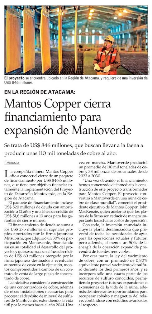 Aseguran US$ 847 millones para Mina Mantoverde - (La Segunda)