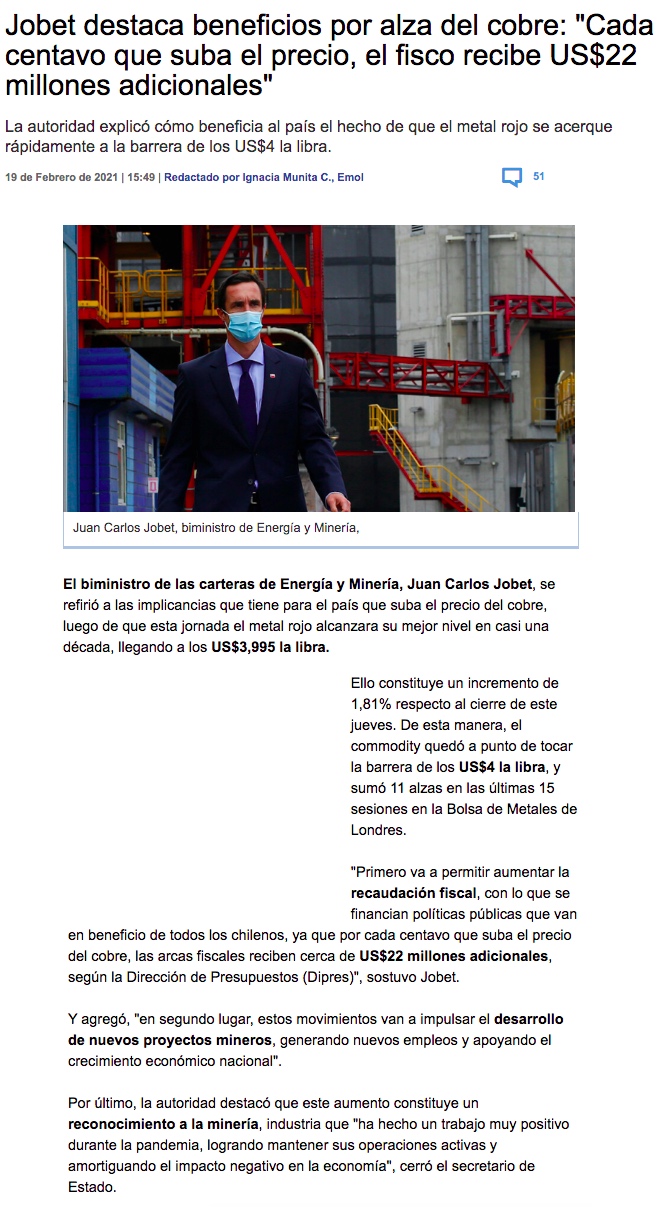 Jobet: “Por cada centavo que suba el precio, el Fisco recibe US$ 22 millones adicionales” - (El Mercurio de Calama)