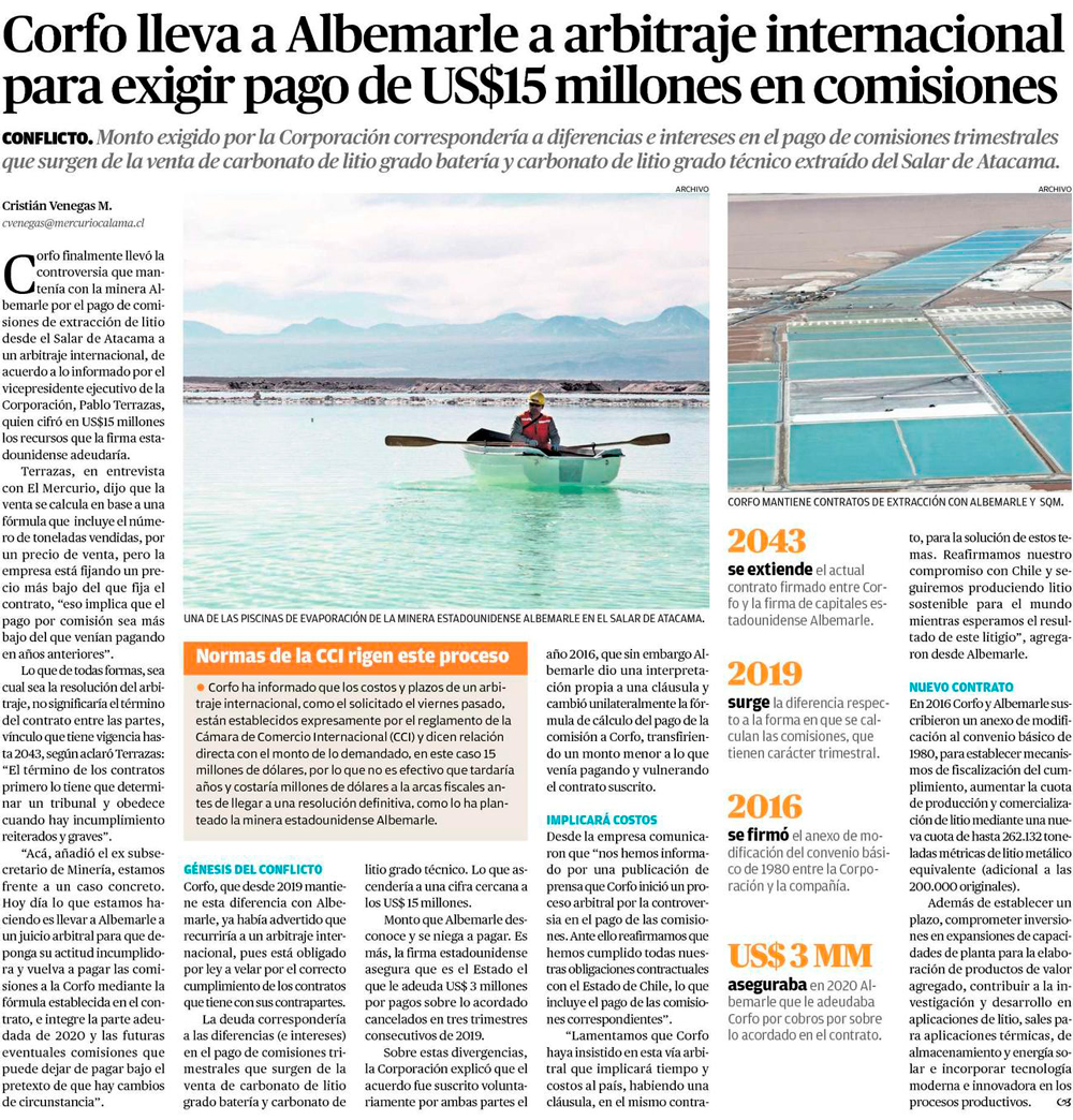 Gobierno golpea la mesa: Corfo lleva a arbitraje a gigante Albemarle, y se desata nuevo conflicto en la industria del litio - (El Mercurio de Santiago)