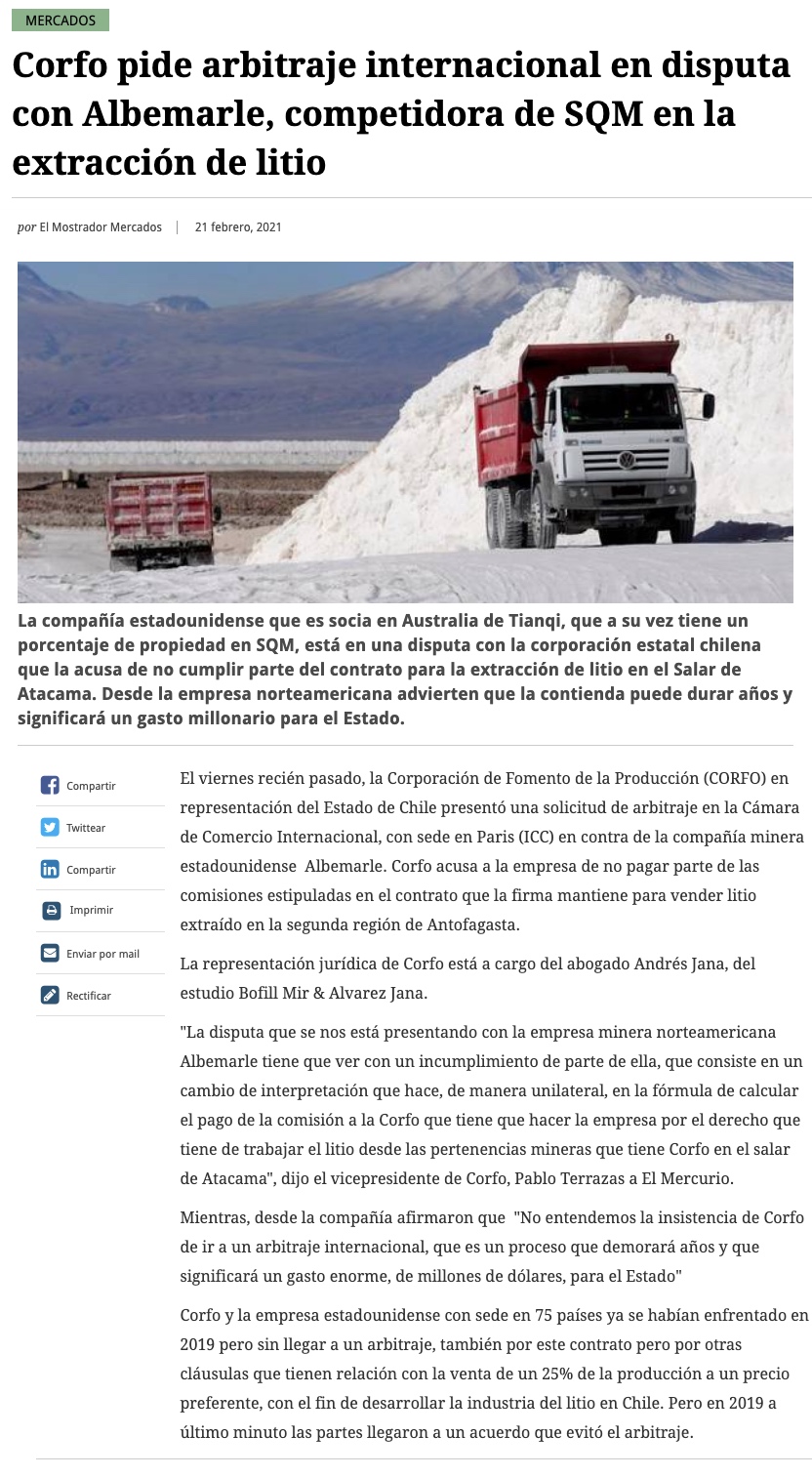 Corfo lleva a Albemarle a arbitraje internacional para exigir pago de US$15 millones en comisiones - (El Mercurio de Antofagasta)