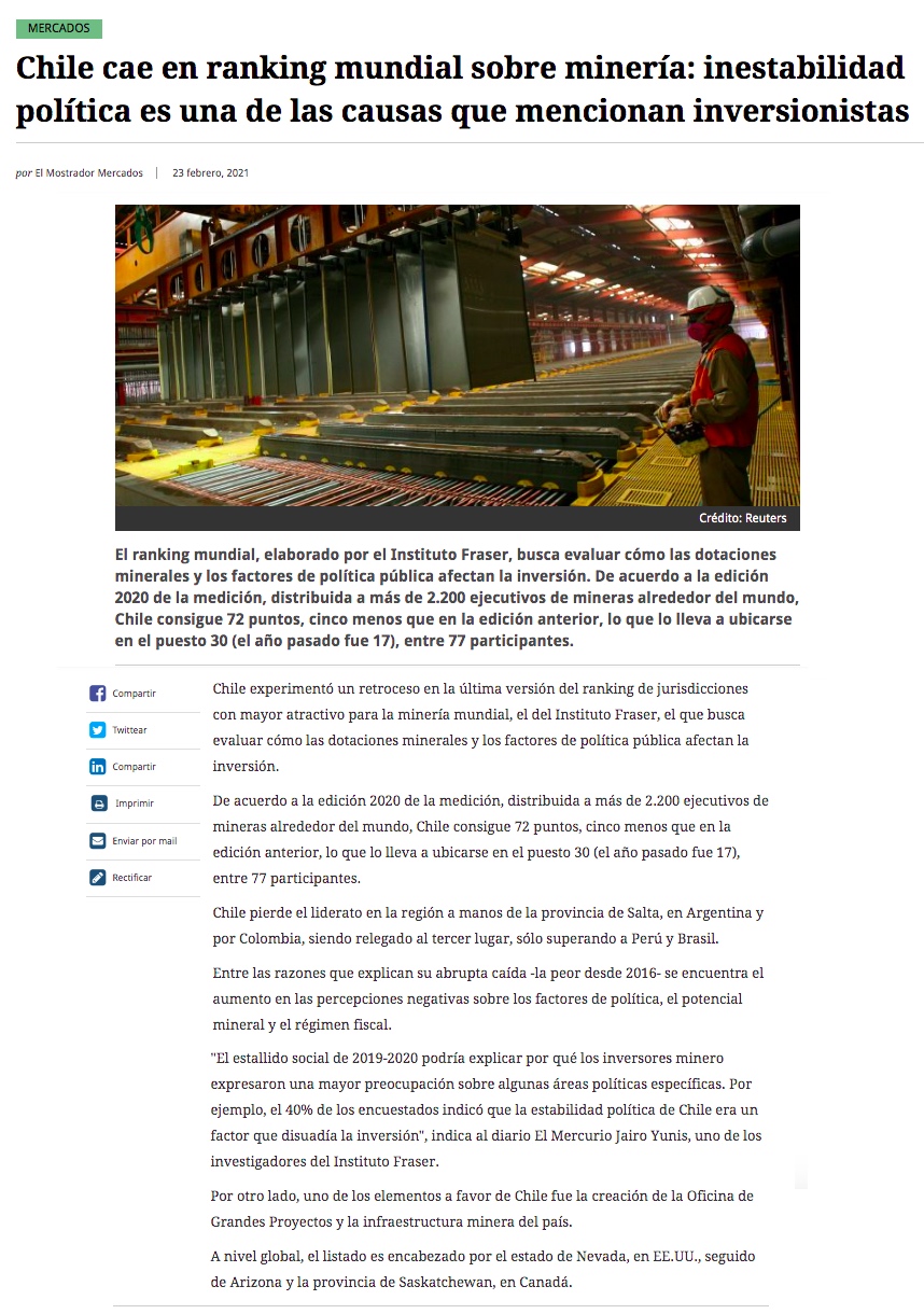 La Cámara Minera de Chile lamenta descenso de Chile en ranking sobre atractivo para el desarrollo minero - (elamerica)