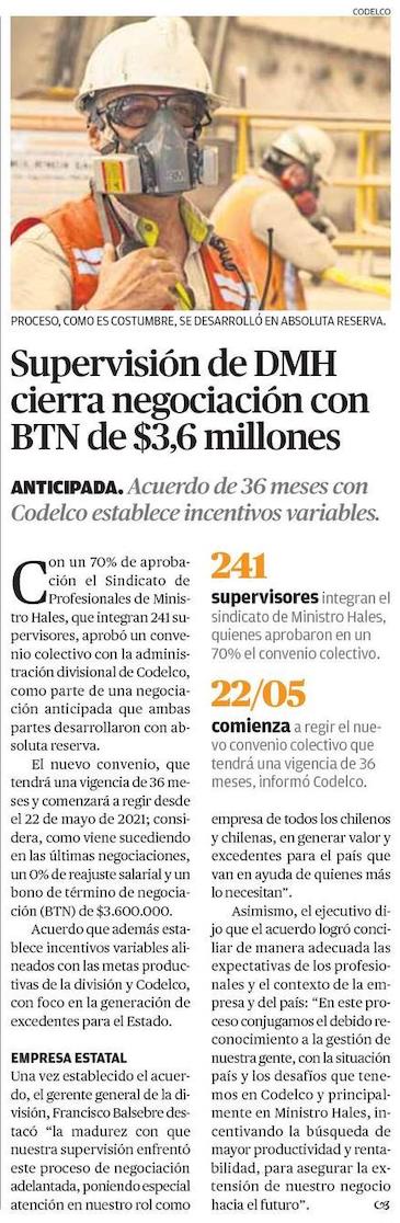 Codelco y Sindicato de Profesionales de División Ministro Hales logran acuerdo en negociación anticipada con bono de $ 3,6 millones - (DF Online)