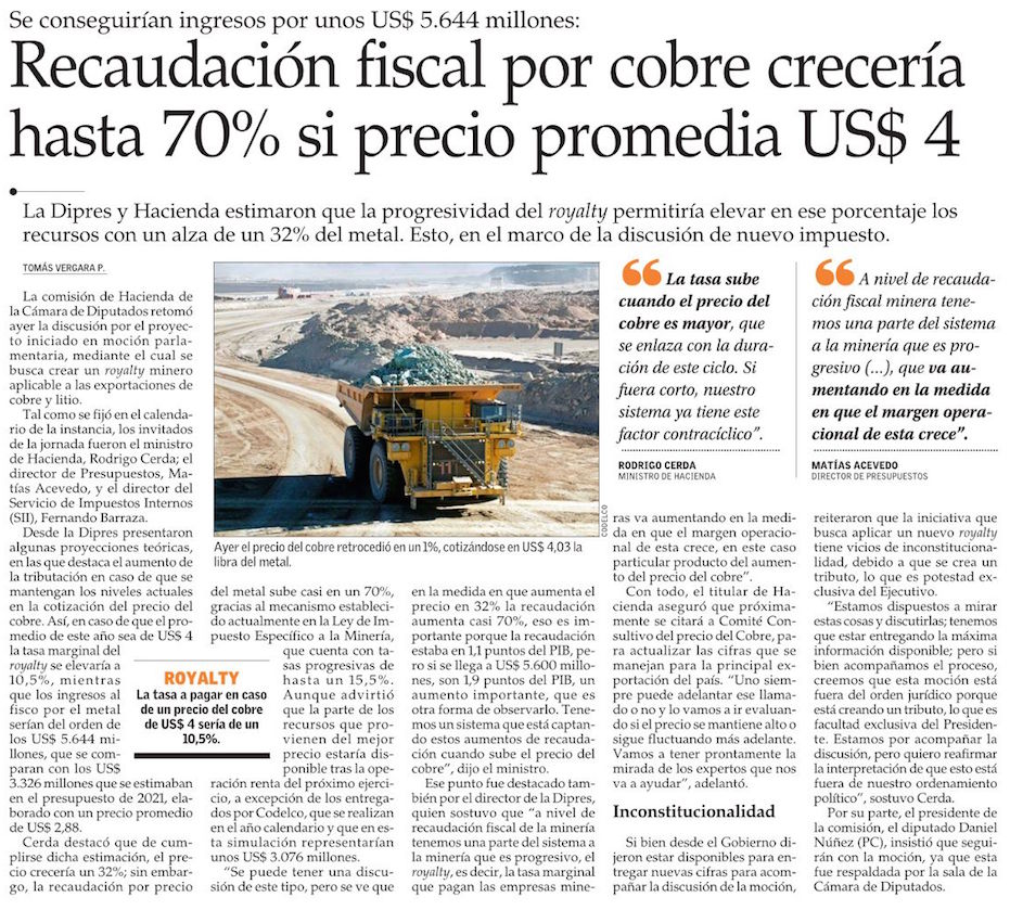 Dipres estima que se recaudarían US$ 5.600 millones de mantenerse cobre a US$ 4 promedio - (Diario Financiero)