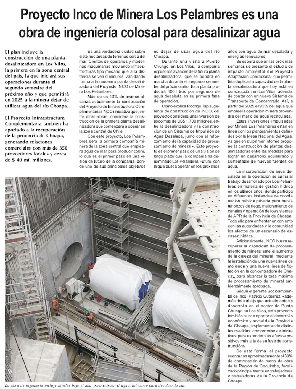 Proyecto Inco de Minera Los Pelambres completa un 40% de avance - (El Mercurio de Santiago)