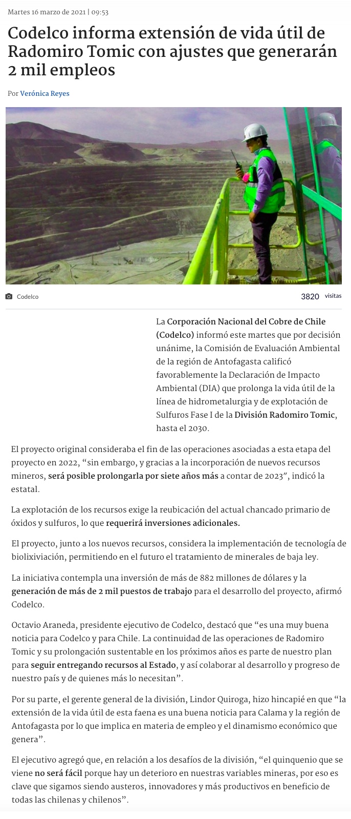 Extensión de Radomiro Tomic hasta el 2030 generará 2 mil puestos de trabajo - (El Mercurio de Calama)