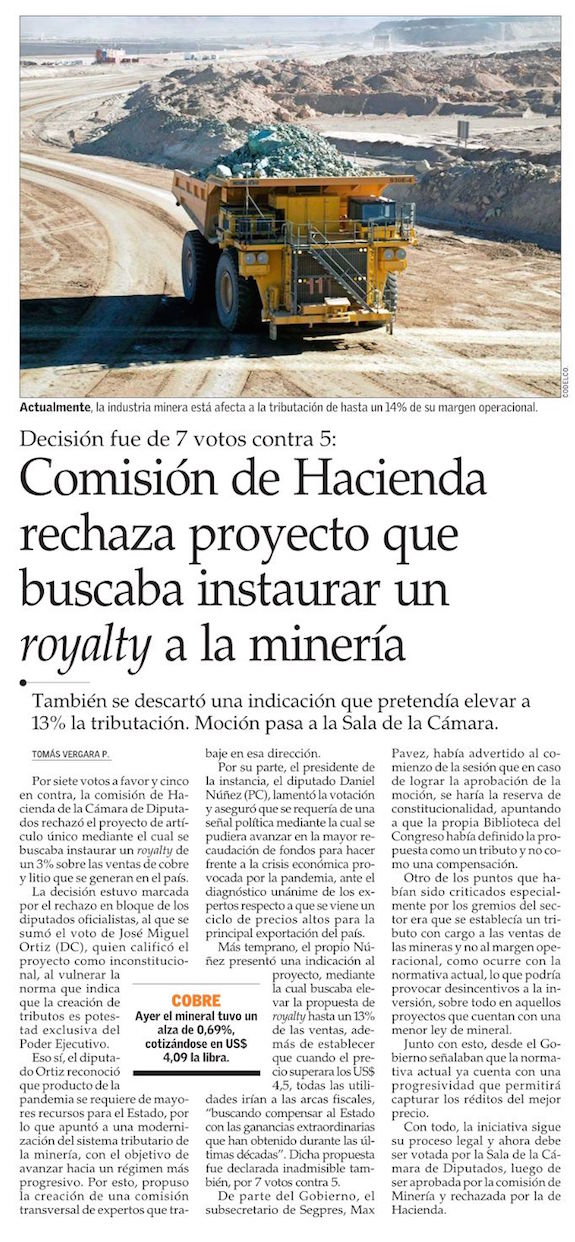 Diputados de la comisión de Hacienda rechazan proyecto de royalty minero - (Diario Financiero)