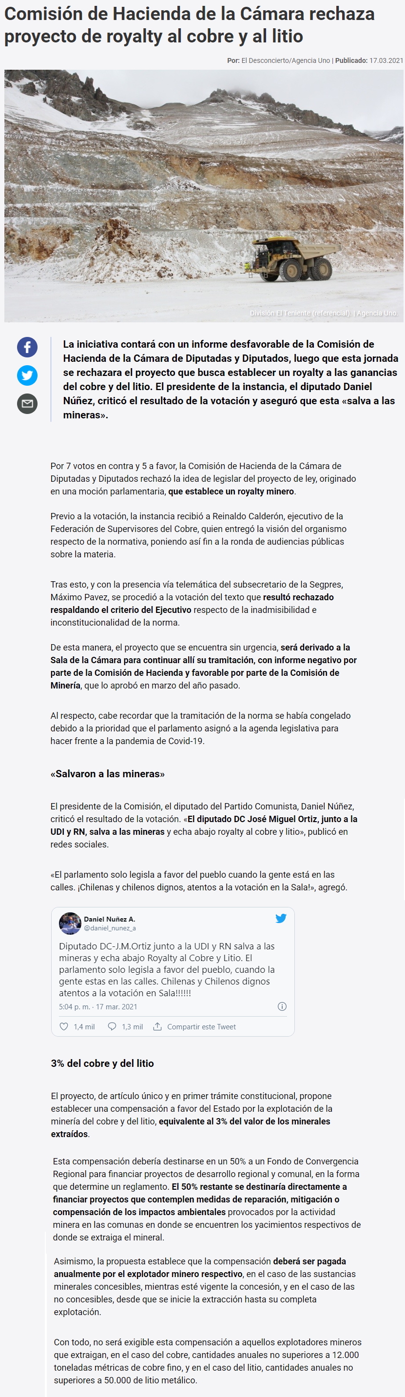Comisión de Hacienda rechaza proyecto que buscaba instaurar un royalty a la minería - (El Mercurio de Santiago)