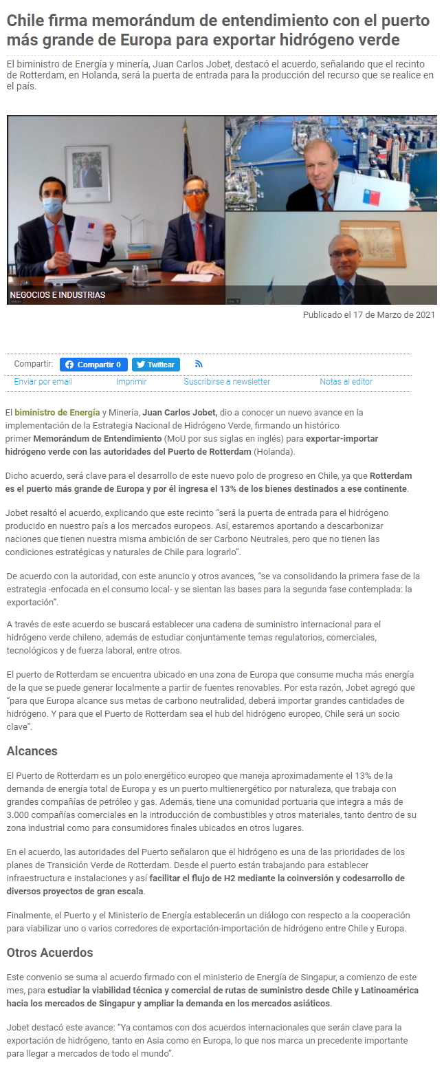 Hidrógeno verde: Energía sella acuerdo con puerto de Rotterdam - (Medios Regionales Cadena El Mercurio)